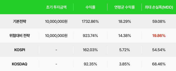 - 위험 대비 전략: 연 수익률은 낮지만 MDD는 3분의 1 수준